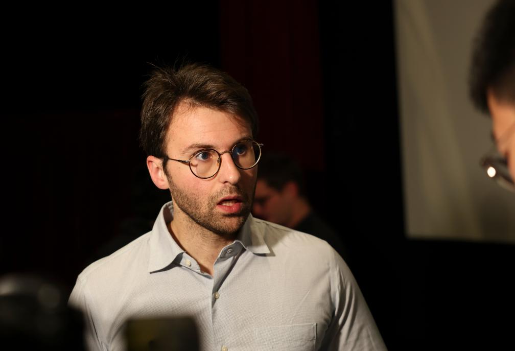 24日、フランス・パリで開かれた上映会の後、取材に応じるマルクス・デトレスさん。(パリ=新華社記者/鄔恵我)