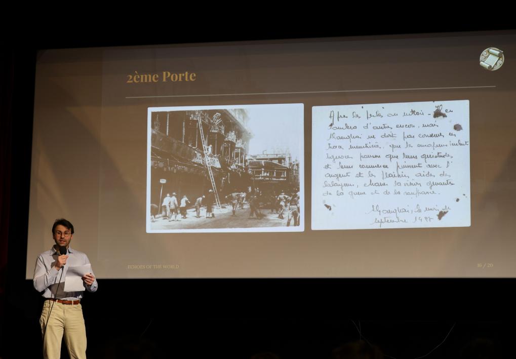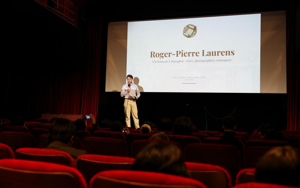 24日、フランス・パリで開かれた上映会で写真を説明するマルクス・デトレスさん。(パリ=新華社記者/鄔恵我)