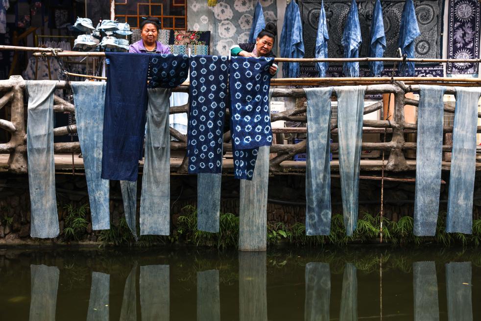 21日、肇興侗寨で藍染め作品を干すトン族の女性、陸紅英(りく・こうえい)さん(右)。(黎平=新華社記者/楊文斌)