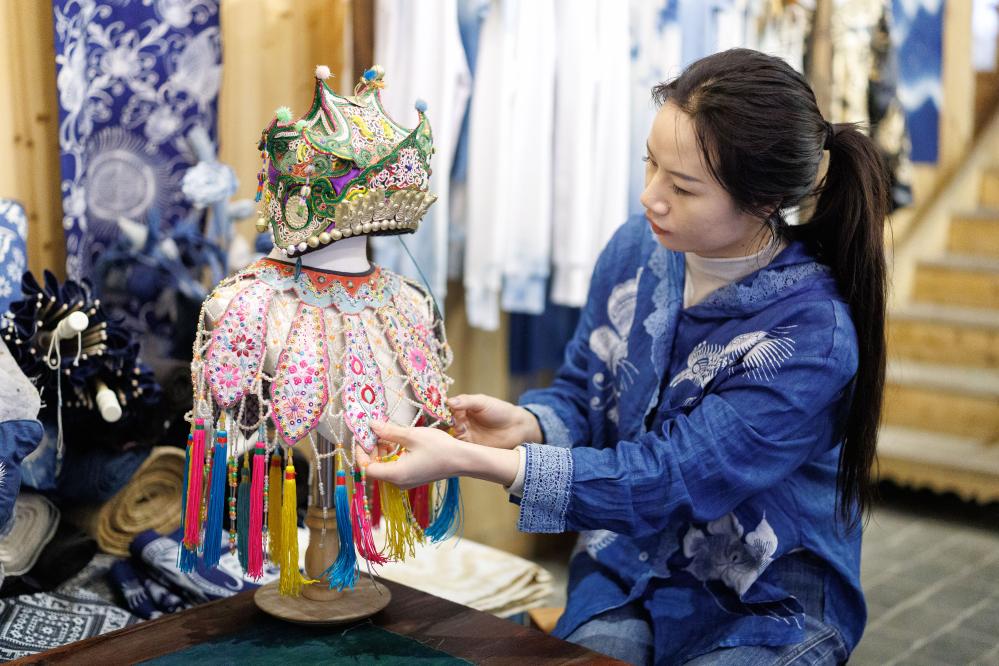 【新華社貴陽4月27日】中国貴州省黔東南(けんとうなん)ミャオ族トン族自治州黎平(れいへい)県にあるトン族集落、肇興侗寨(ちょうこうとうさい)などでは、藍染めや刺繡(ししゅう)などの無形文化遺産の伝統的な技法が千年余りにわたり受け継がれてきた。糸紡ぎや機織り、打靛(だでん=藍色の抽出)、染色、刺繡は古くから日々の暮らしに溶け込み、トン族文化の象徴となっている。