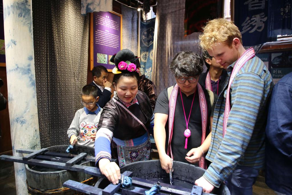 肇興侗寨で藍染めを体験する外国人観光客。(3月23日撮影、黎平=新華社配信/呉光輝)