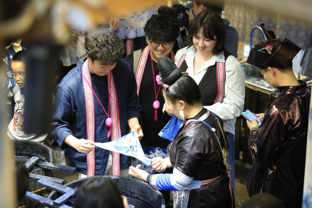 外国人観光客に藍染めを教える地元の人(右から3人目)。(3月23日撮影、黎平=新華社配信/呉光輝)