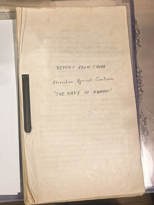 サットン氏が記した「中国に関する報告 民間人への暴虐行為・南京大虐殺」。(資料写真、南京=新華社記者/蔣芳)