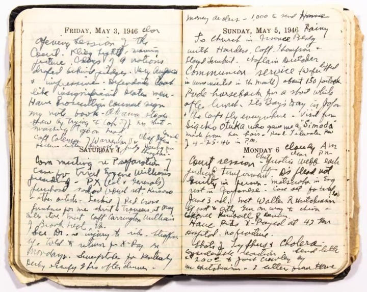 東京裁判の初公判に関する内容を記したサットン氏の日記。(資料写真、南京=新華社配信/鄒徳懐)