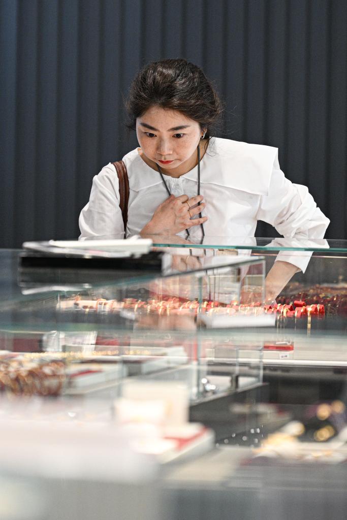 海南省の博鰲(ボアオ)免税店で商品を選ぶ客。(3月27日撮影、ボアオ=新華社記者/蒲暁旭)