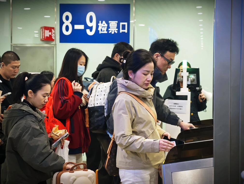 北京南駅で改札を通過する旅客。(4月6日撮影、北京=新華社記者/邢広利)