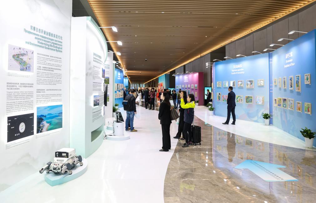 29日、フォーラムの展示作品を見学する出席者。(寧波=新華社記者/江漢)