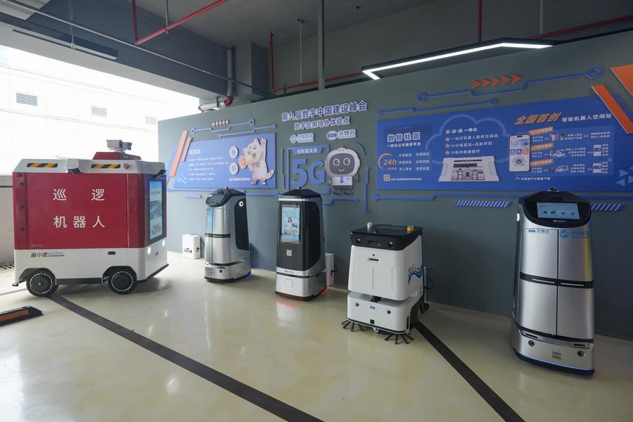 29日、社区用スマートロボットステーションに並ぶロボット。(福州=新華社配信/肖和勇)