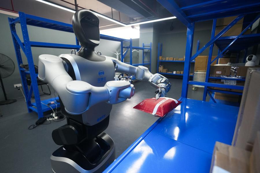29日、小包を運ぶ人型ロボット。(福州=新華社配信/肖和勇)