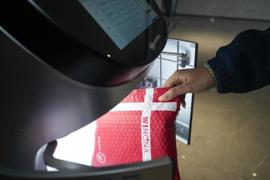 29日、配送ロボットから小包を取り出すスタッフ。(福州=新華社配信/肖和勇)