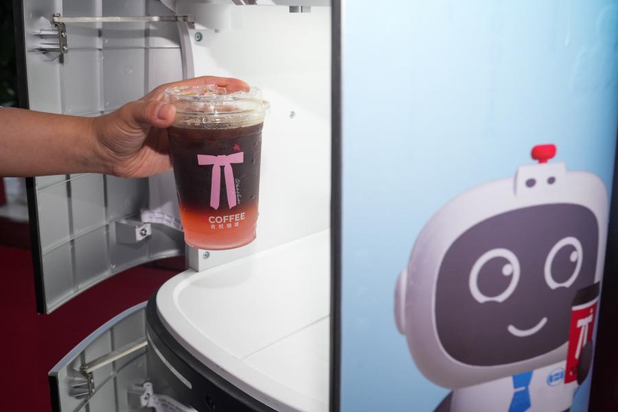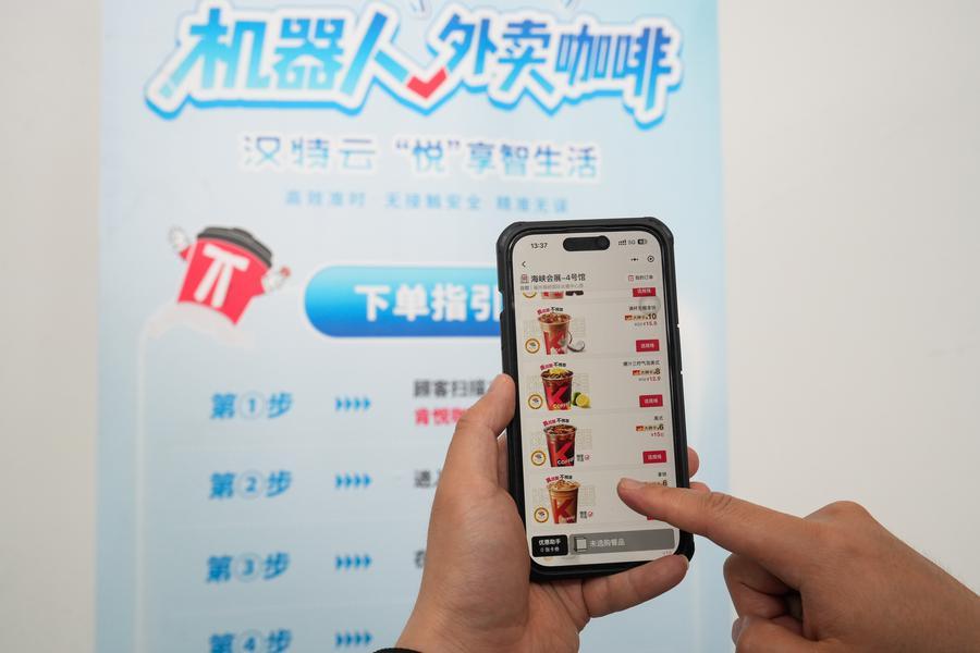 29日、配送ロボットから取り出されたコーヒー。(福州=新華社配信/肖和勇)