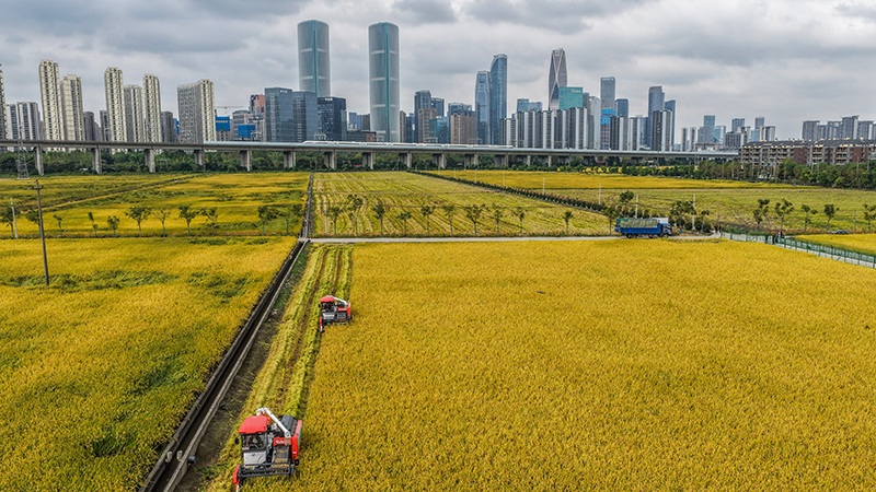 黄金色の水田と高層ビル群が共演 中国・杭州市