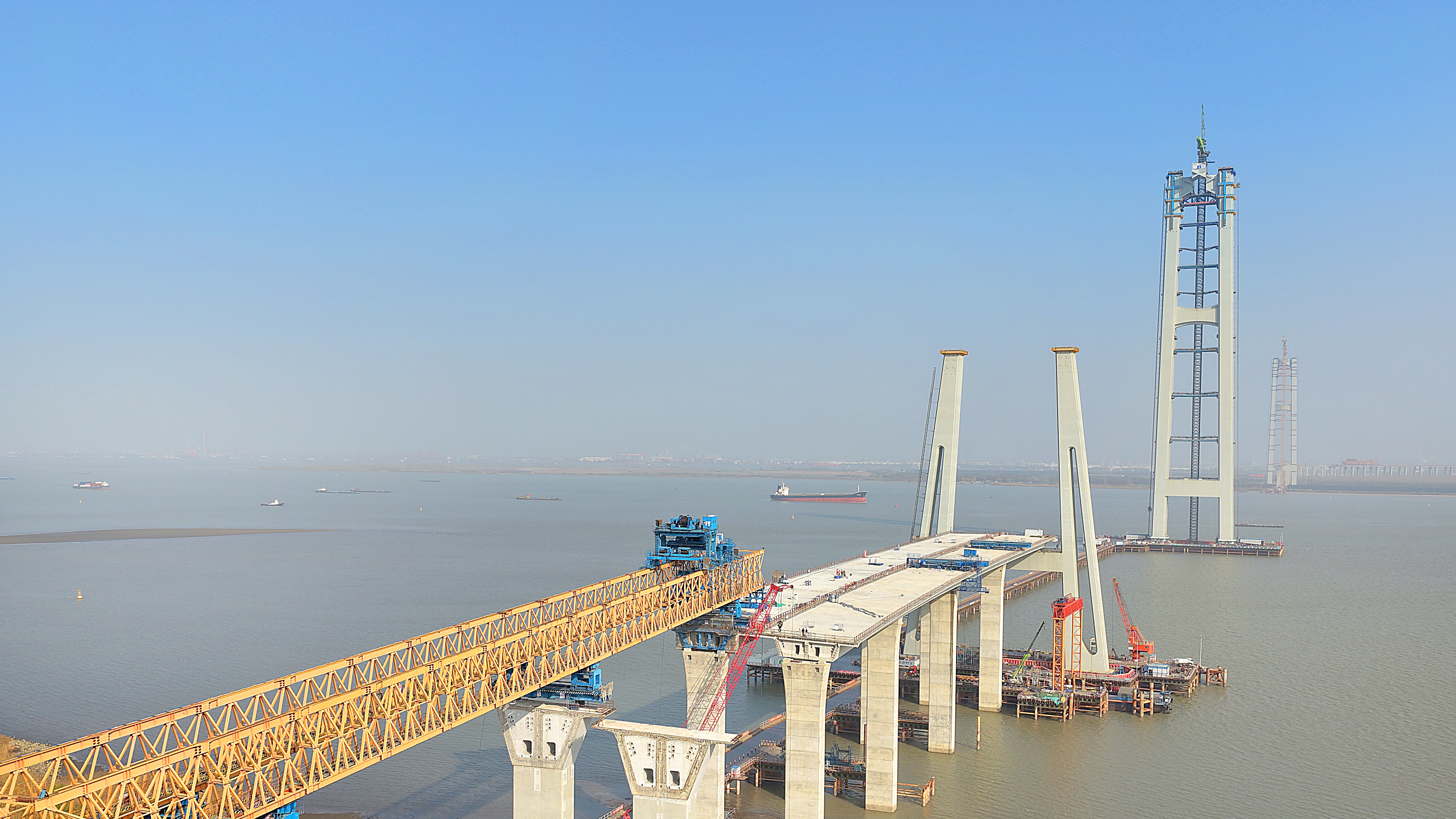 張靖皋長江大橋、南航路橋の主塔頂部が完成 中国江蘇省