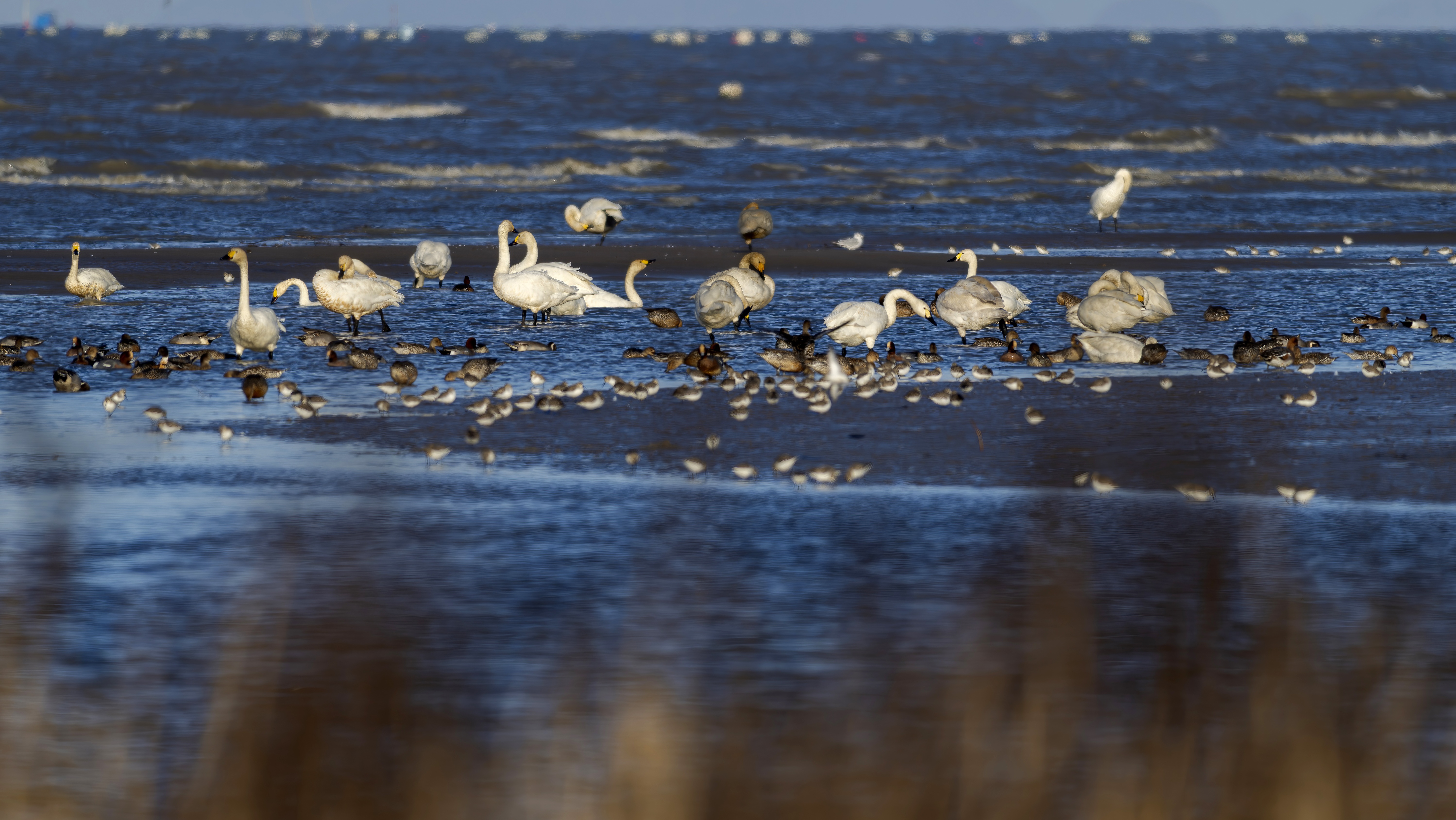 閩江河口湿地にコハクチョウの群れ 中国福建省