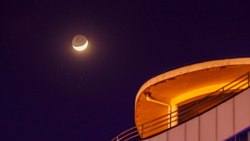 三日月とプレアデス星団が夜空で競演 中国黒竜江省