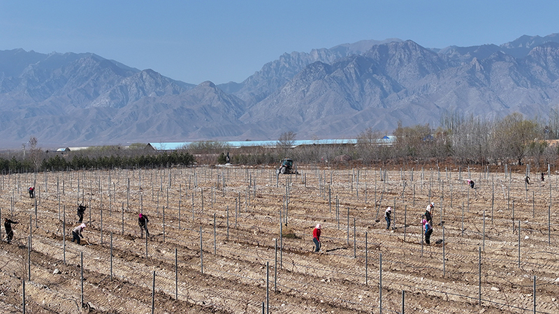 賀蘭山麓でワイン用ブドウ棚作り始まる 中国寧夏回族自治区