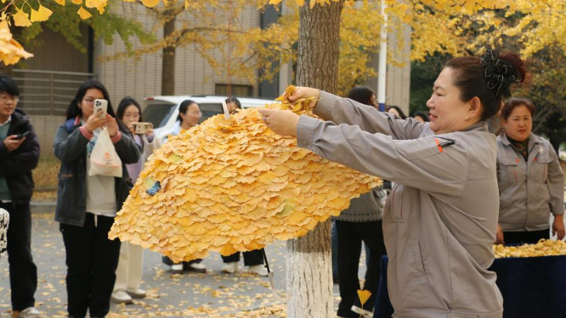 イチョウの落ち葉でキャンパスを彩る 中国・大連市