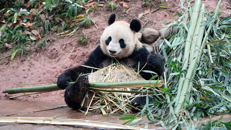 パンダのシンシン、好物の竹にご満悦 中国四川省