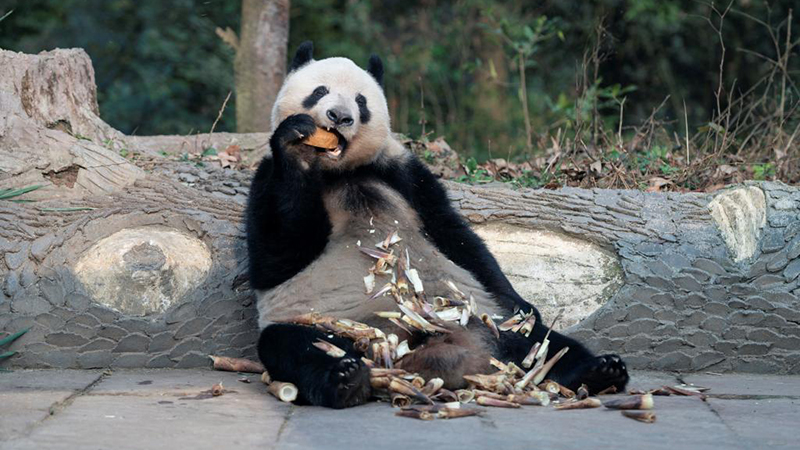 パンダのシャンシャン、豪快な食事風景 中国四川省