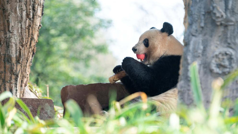 パンダのシャンシャン、寒さに負けず蒸しパン堪能 中国四川省